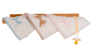 Muselinas bebé en colores surtidos, blanco, celeste, gris y rosa .Son personalizables con el nombre o inicial bordadas