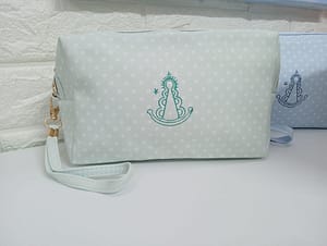 Neceser rectangular de tamaño medio con la silueta bordada de la Virgen del Rocío, disponible en varios colores tanto con estampado de lunares como en tonos lisos. Cuenta con una practica asa para llevarlo con más facilidad. Posibilidad de personalizar con iniciales .Tiene gran capacidad para llevar todo el maquillaje bien organizado o con productos de cuidado facial o intima. Otro uso para este practico neceser es el de organizador de bolsos y llevar pertenencias importantes a mano.