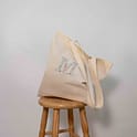 Tote bag confeccionada con tela de loneta con inicial en aplique bordada con telas de temática floral o lunar de tamaño pequeño.